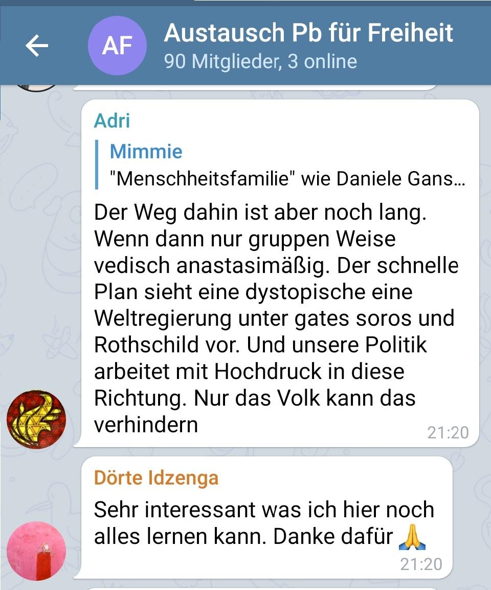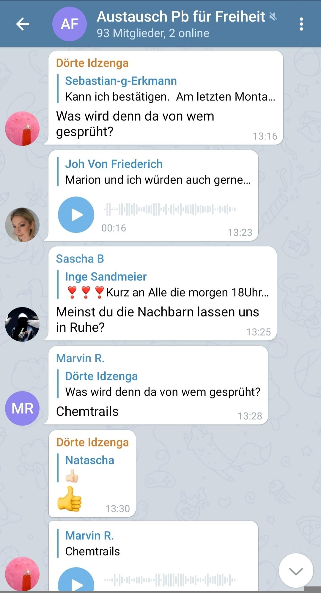 Mit Blick auf ihre interne Kommunikation via Telegram lässt sich dieses Bild allerdings recht schnell erschüttern. Der Organisationskreis hat sich in eine interne und eine offene Gruppe aufgeteilt und während in Letzterer zumindest noch versucht wird, den Schein zu wahren, teilen die Mitglieder der internen Gruppe „Austausch Pb für Freiheit“ – die etwa 90 Mitglieder umfasst – sehr offen ihr verschwörerisches und antisemitisches Weltbild mit. Das wird der offenen Gruppe verheimlicht und diese dadurch angelogen. So wird sich beispielsweise darauf geeinigt den inzwischen offen rechtsradikalen und verschwörungsideologischen Attila Hildmann [1-4] zwar noch in der internen aber nicht mehr in der offenen Gruppe zu teilen, um dort einen bürgerlicheren Eindruck zu machen.